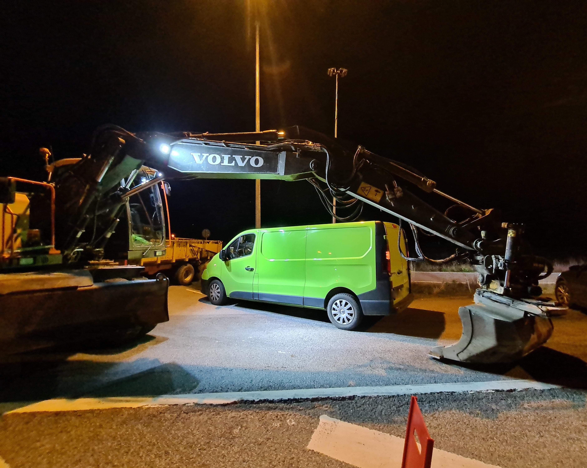 Johannes arbetade nattetid med sin grävmaskin vid ett vägarbete. Plötsligt körde en skåpbil in i den skyddsbil som skyddar vägarbetarna.